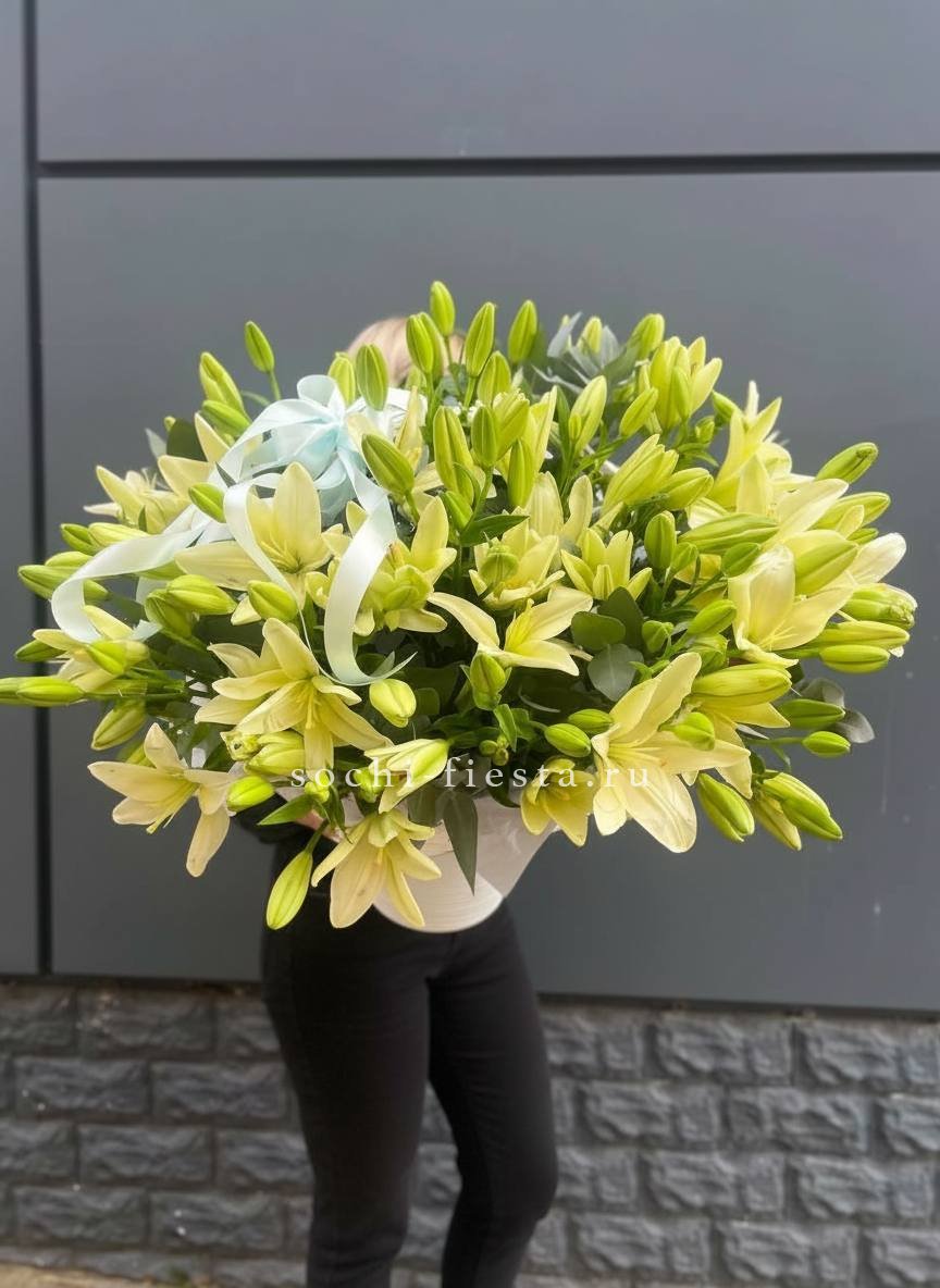 лилии в корзине с эвкалиптом На фото 23 шт.