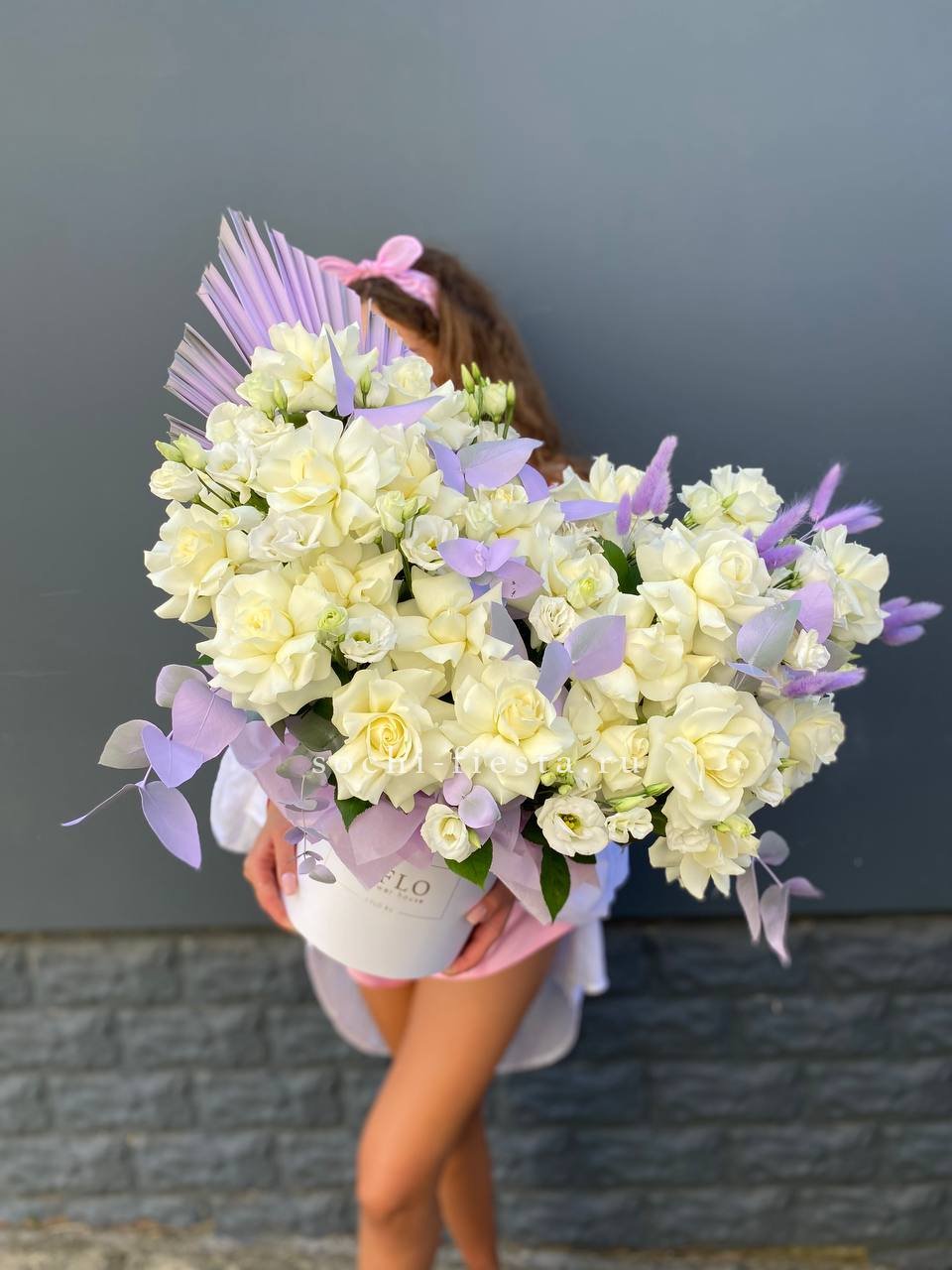 Маттиола и диантусы наполняют корзину летним ароматом. Кустовые розы чередуются с эустомой, создавая мягкий переход оттенков.