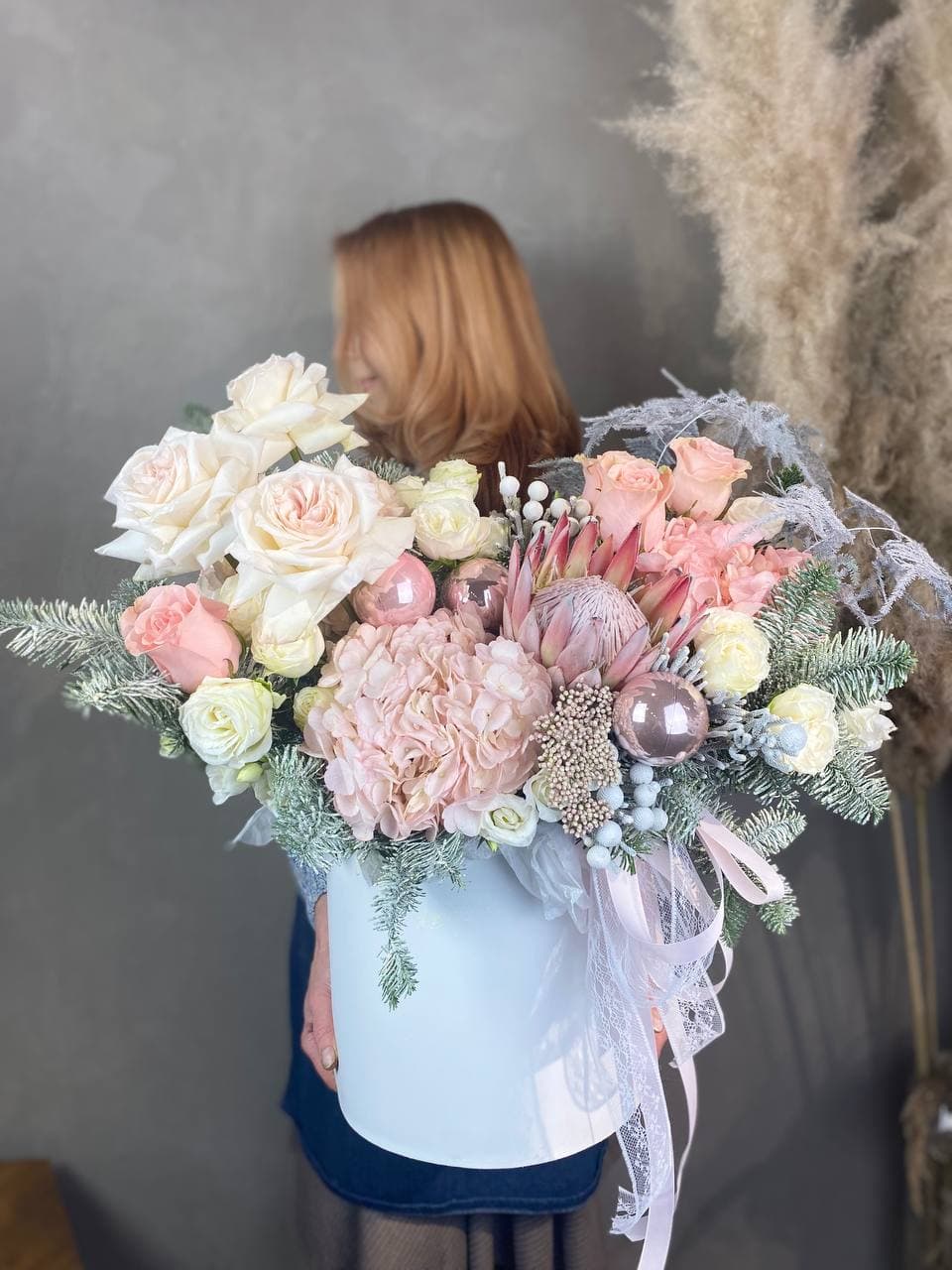 датский нобилис, гортензия, протея, хамелациум, пионовидные кустовые розы, аспарагус, эвкалипт, бруния, набор ёлочных украшений, цилиндр Готовая композиция может иметь незначительные внешние отличия от примера на фотографии, вместе с тем, сохранит гамму и фактуру.