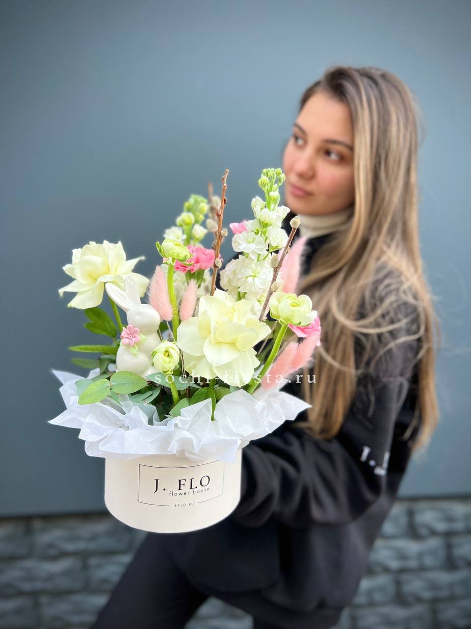 Цветочная композиция идеальна для Православных Праздников! Состав выполнен из белых роз, вербы, маттиолы, лагуруса и керамического кролика!