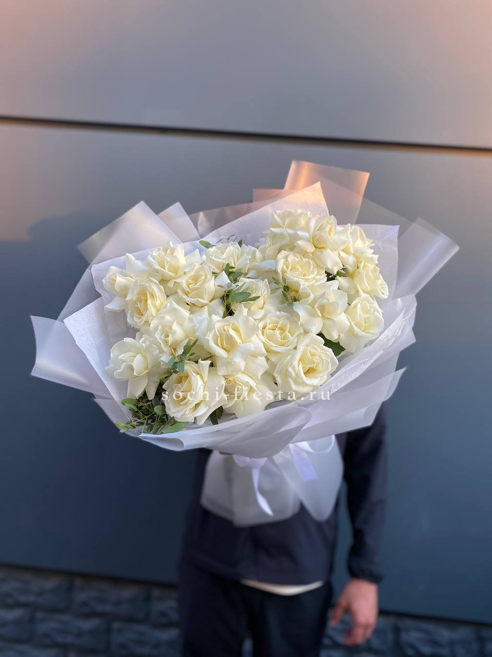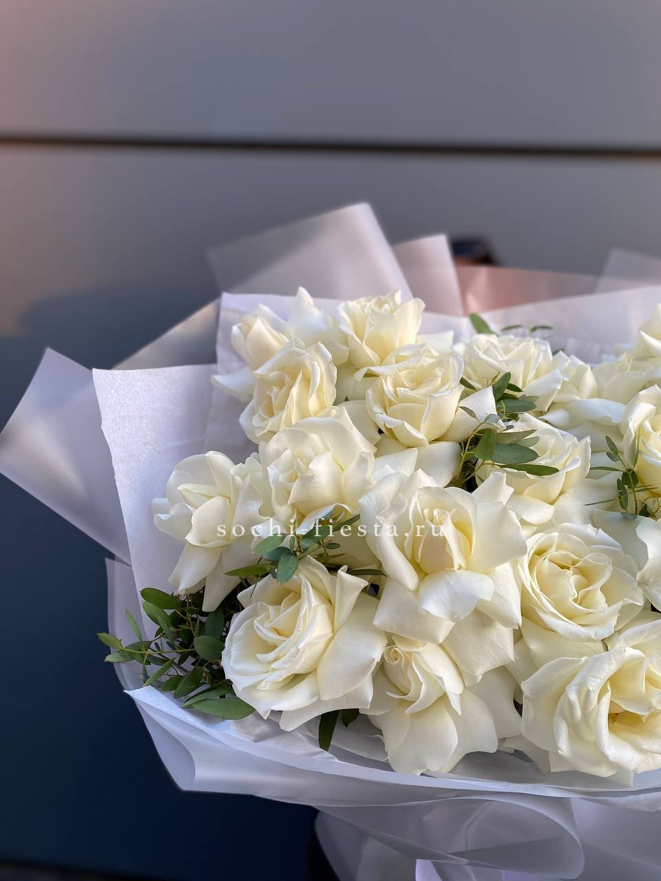 Семь пионовидных роз образуют компактный букет с мягкими линиями и спокойным ритмом. Ветви эвкалипта добавляют воздушности и завершают композицию.