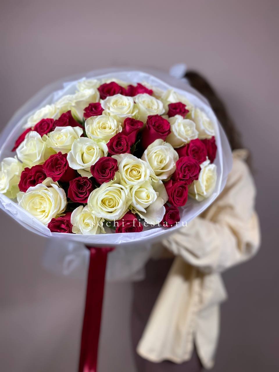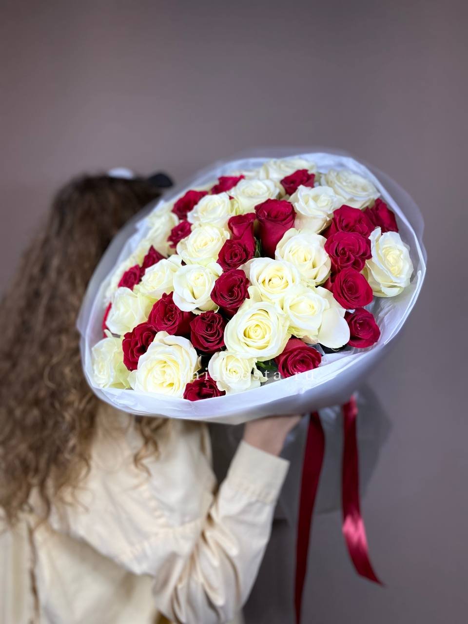 Длинные стебли и крупные бутоны в палитре микс создают букет с графичным силуэтом. Сто одна роза выстраивается в плотную композицию с выразительной вертикалью.
