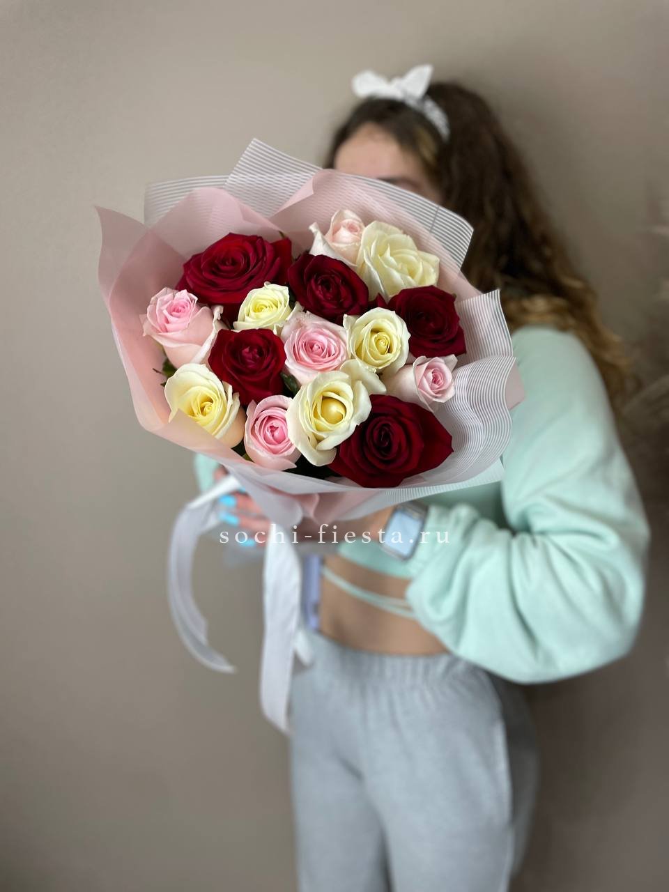 Розы Carousel радуют двухцветными лепестками с плавными переходами от кремового к малиновому краю. Пятнадцать бутонов собраны в аккуратную форму, которая долго сохраняет свежесть и яркость.