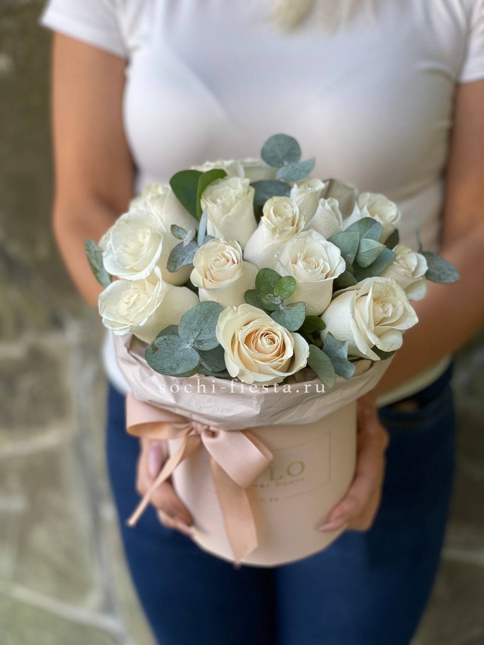 Девятнадцать белых роз в лаконичной крафтовой упаковке держат чёткий силуэт. Прямые стебли и плотные бутоны создают графичную композицию.