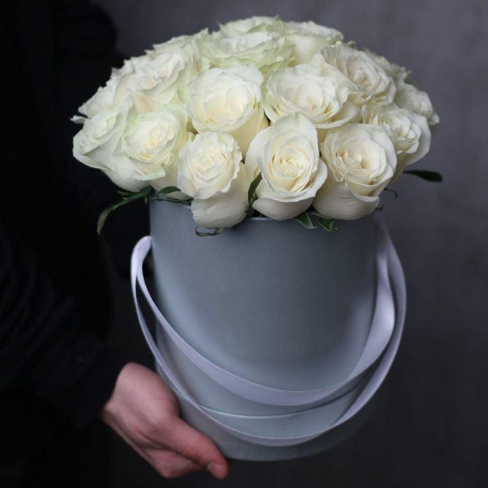 Пятнадцать белоснежных роз собраны в лаконичную форму и упакованы в цилиндр. Монохромная композиция выглядит свежо и современно в любом интерьере.