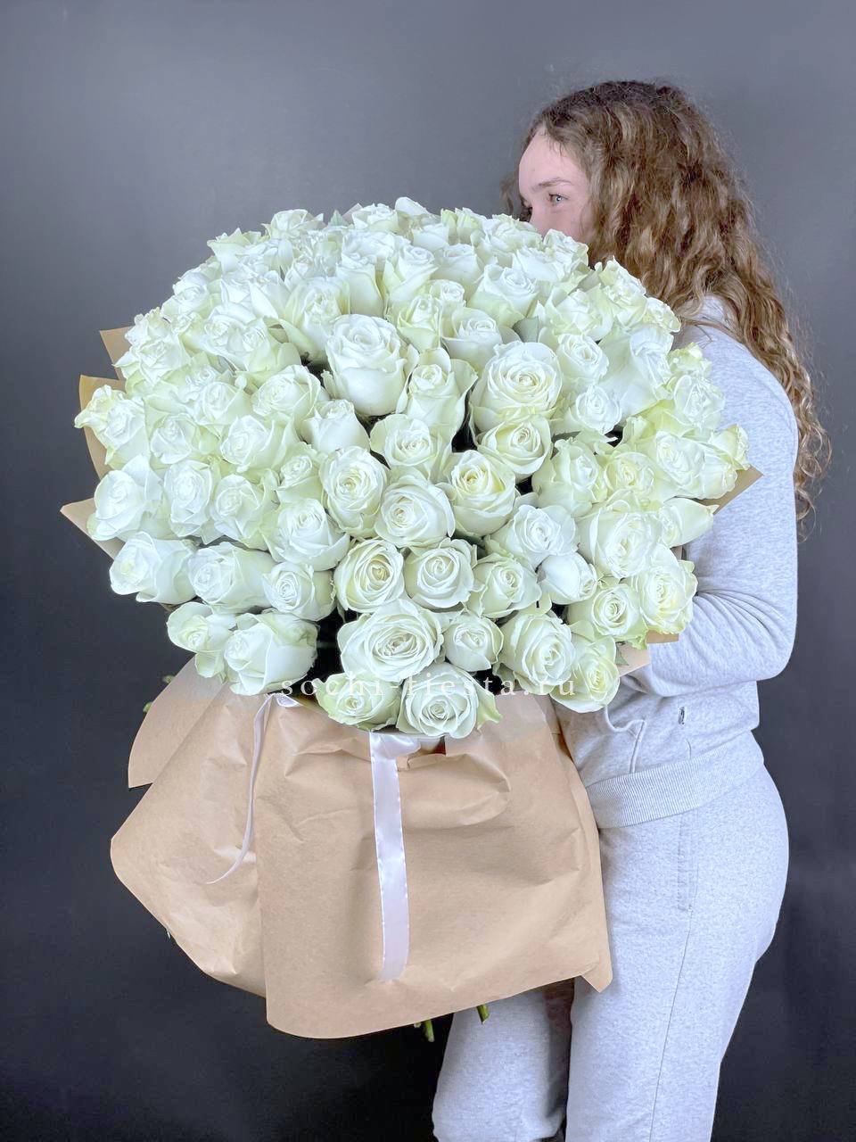 Тридцать семь белых французских роз собраны в круглый бокс с ветками эвкалипта. Плотная укладка бутонов создает объемную композицию, где каждый цветок виден и держит форму. Безупречное решение для яркого события.