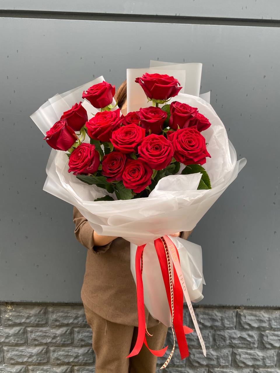 Пятнадцать красных роз в лаконичной упаковке держат безупречную вертикаль и собраны так плотно, что линия букета остаётся чёткой и графичной. Форма читается с любого угла и не теряет выразительности даже в высоких вазах.