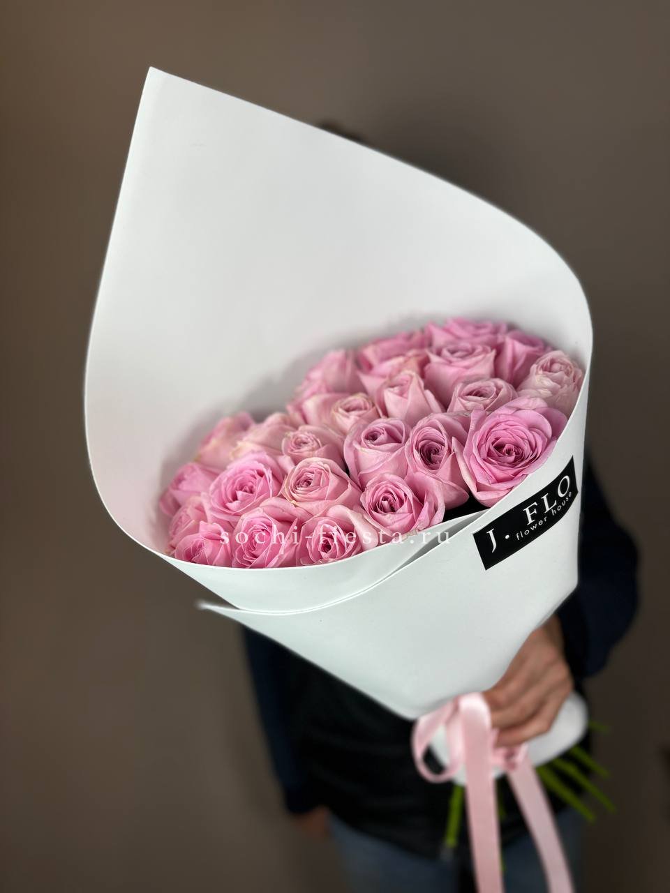 Тридцать пять стеблей формируют объемную композицию в розовой гамме. Букет занимает пространство уверенно и держит форму за счет плотной сборки. Классика, которая работает всегда.