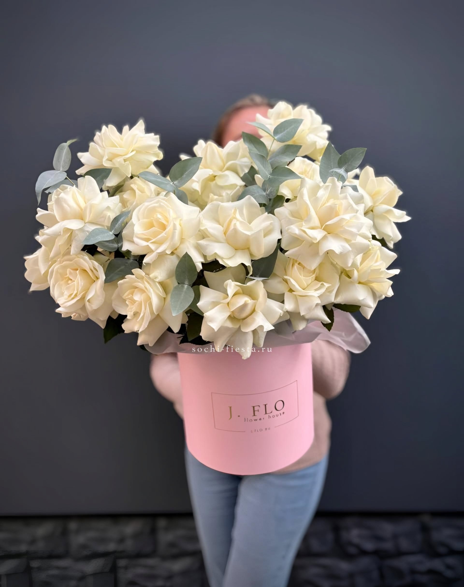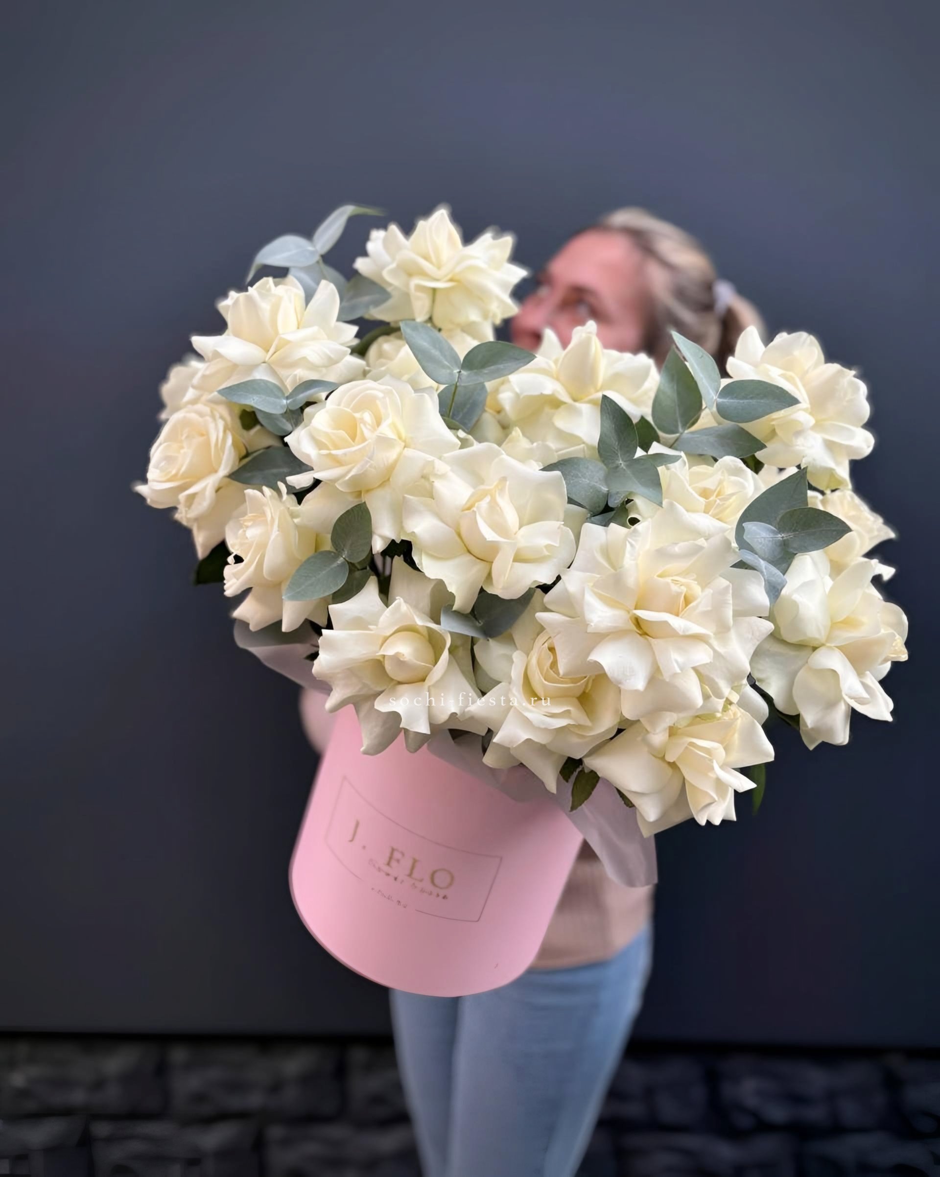 Французские розы собраны в плотную округлую форму, где каждый бутон раскрывается слоями. Веточка эвкалипта добавляет графичности общей композиции. Букет из одиннадцати роз держит форму и выглядит завершенно в авторской упаковке.