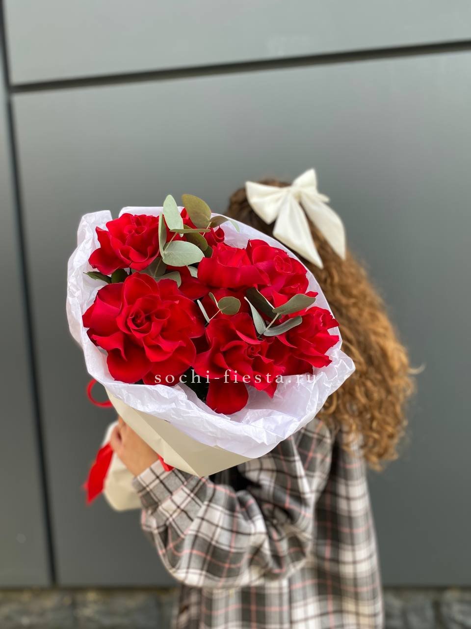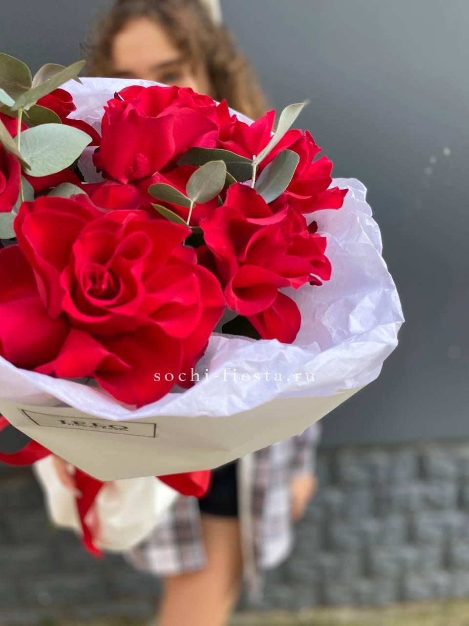 французские розы - 11 шт., эвкалипт-1шт, лента, авторская упаковка.