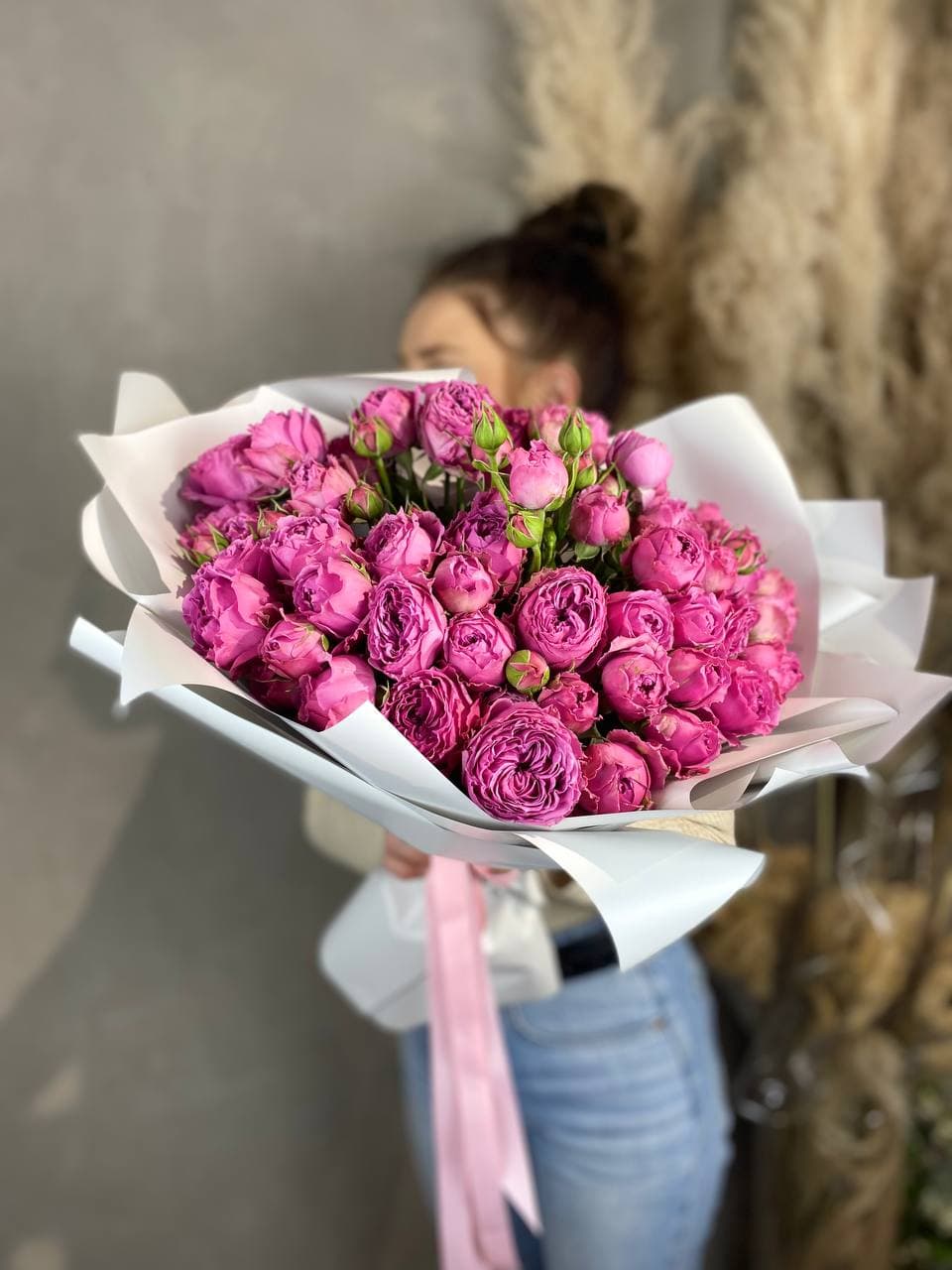 кремовые кустовые розы, лагурус, лента, дизайнерская пленка комбинированная.