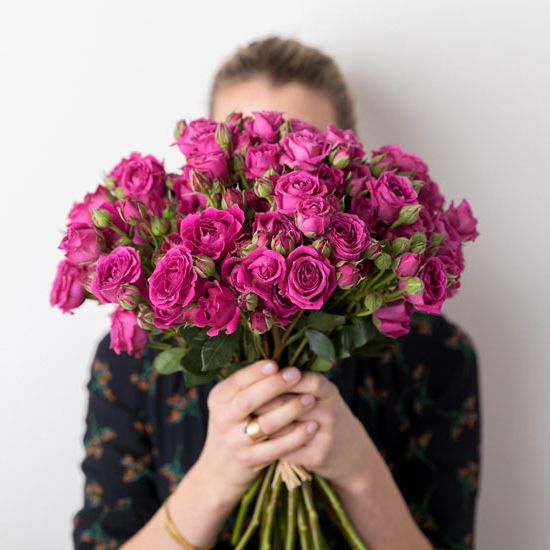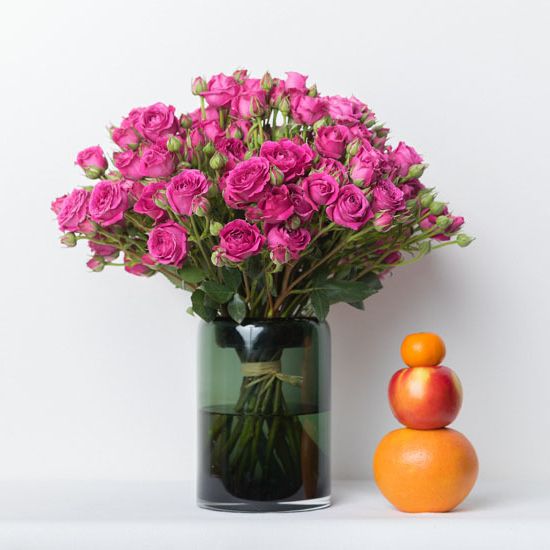 Двадцать один стебель кустовой розы собран в свободную композицию. Многоцветковые веточки формируют воздушный объем с естественным ритмом расположения бутонов.