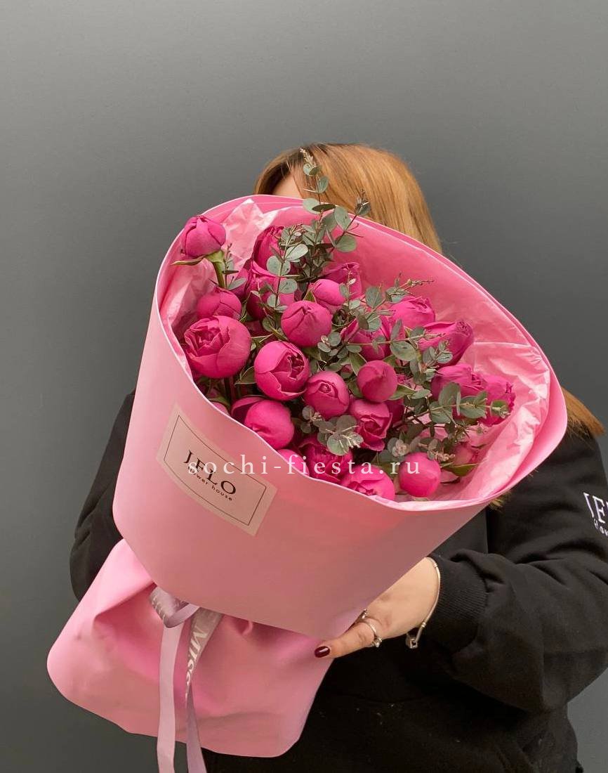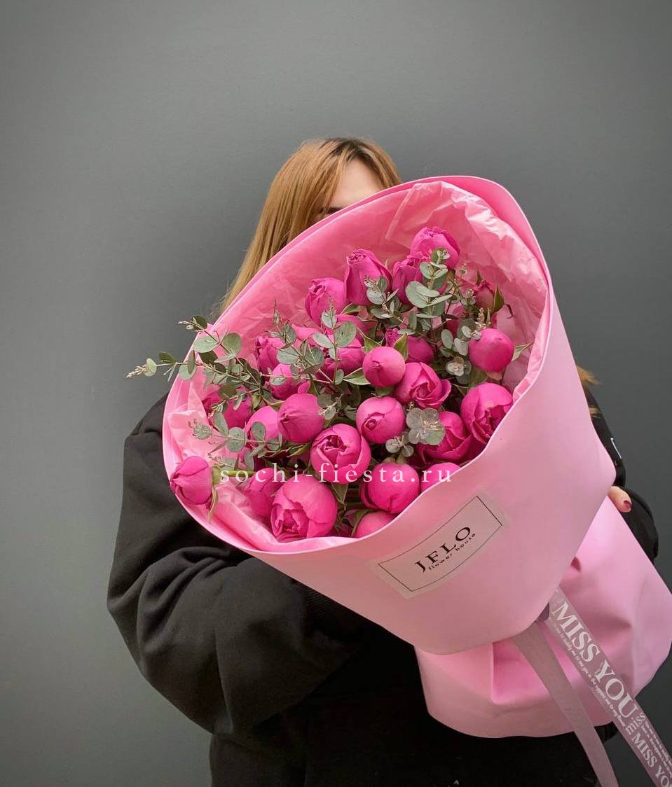 Минимальный состав: 35 пионовидных кустовых роз Мисти бабблс, лента, авторское оформление.