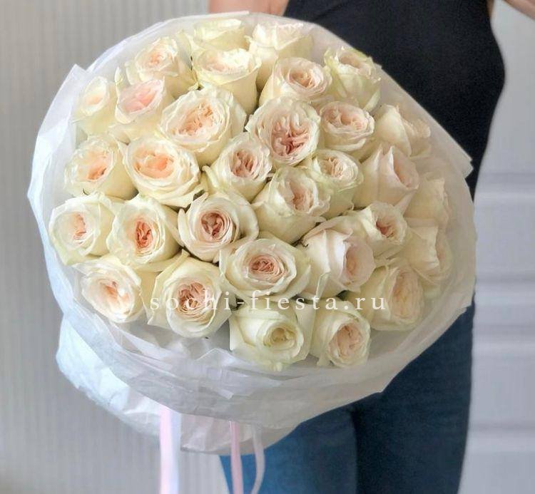 Тридцать пять роз O'hara с густыми кружевными бутонами формируют пышную композицию персиково-кремового тона. Классическая подача в прозрачной плёнке подчёркивает красоту каждого цветка.