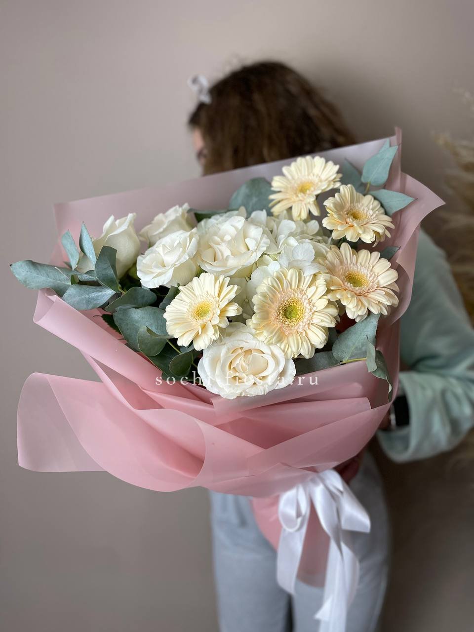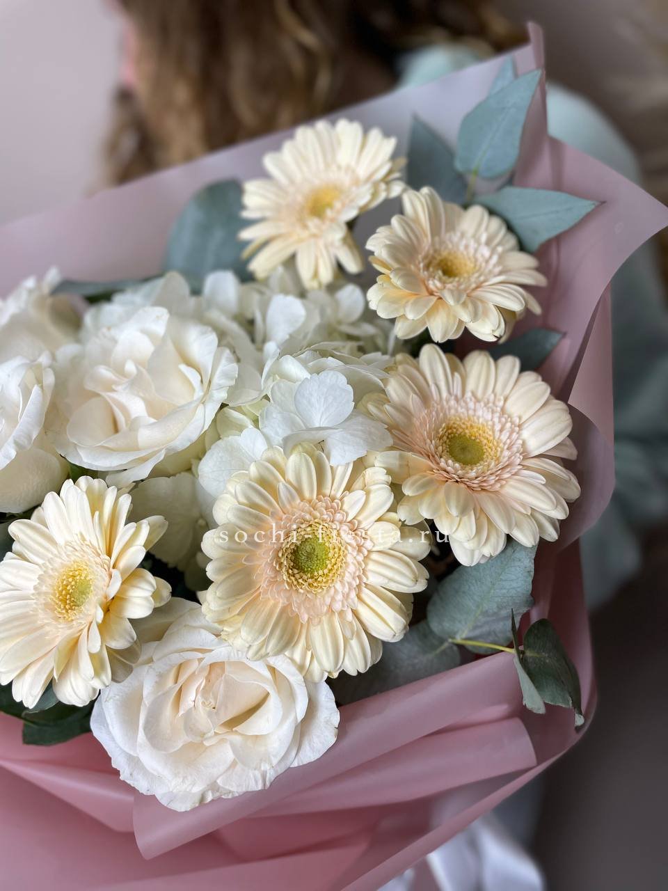 Пастельная гамма с лёгким касанием зимнего воздуха. Кустовые розы и диантус окружены воздушным ковылём, создавая мягкую текстуру с едва уловимой графикой. Гортензия добавляет объём, не перегружая силуэт.