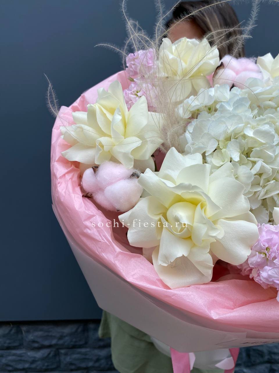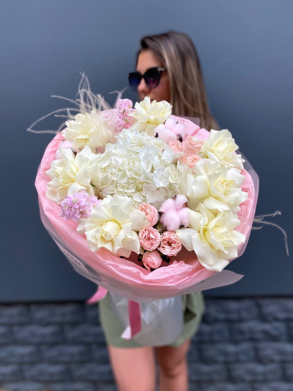 Пышные шапки гортензии задают объём, а россыпь кустовых роз создаёт живую текстуру по всей форме. Композиция наполнена воздухом и естественной лёгкостью.