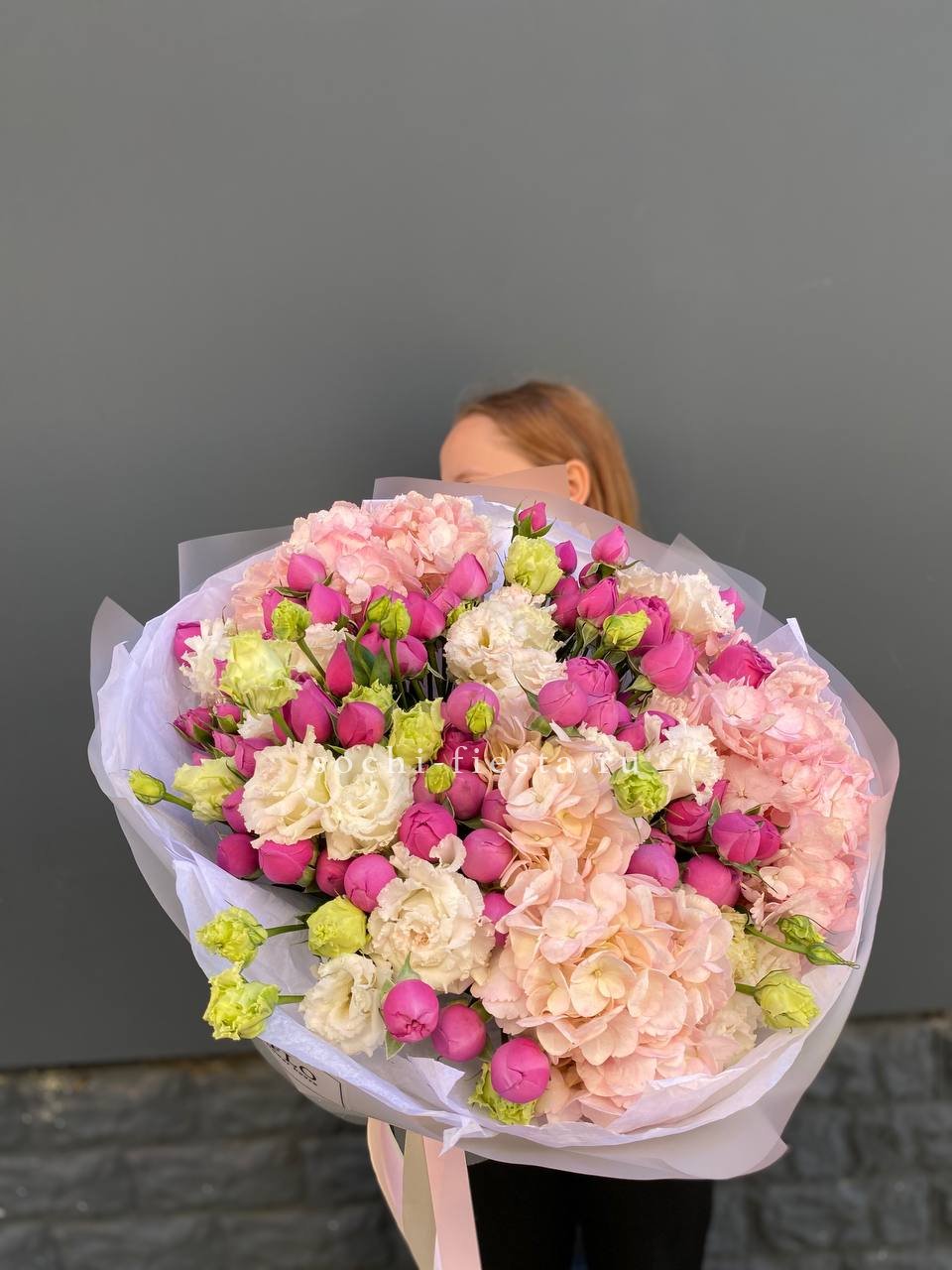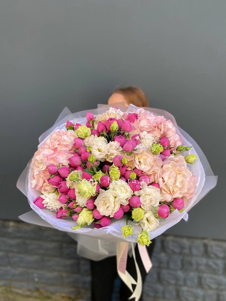 Яркая композиция объединяет пышную гортензию, игривые соцветия диантуса и солнечные хризантемы. Бомбастик добавляет объёма, а озотамнус создаёт лёгкую воздушность между крупными бутонами. Букет радует глаз насыщенными красками и жизнерадостным характером.