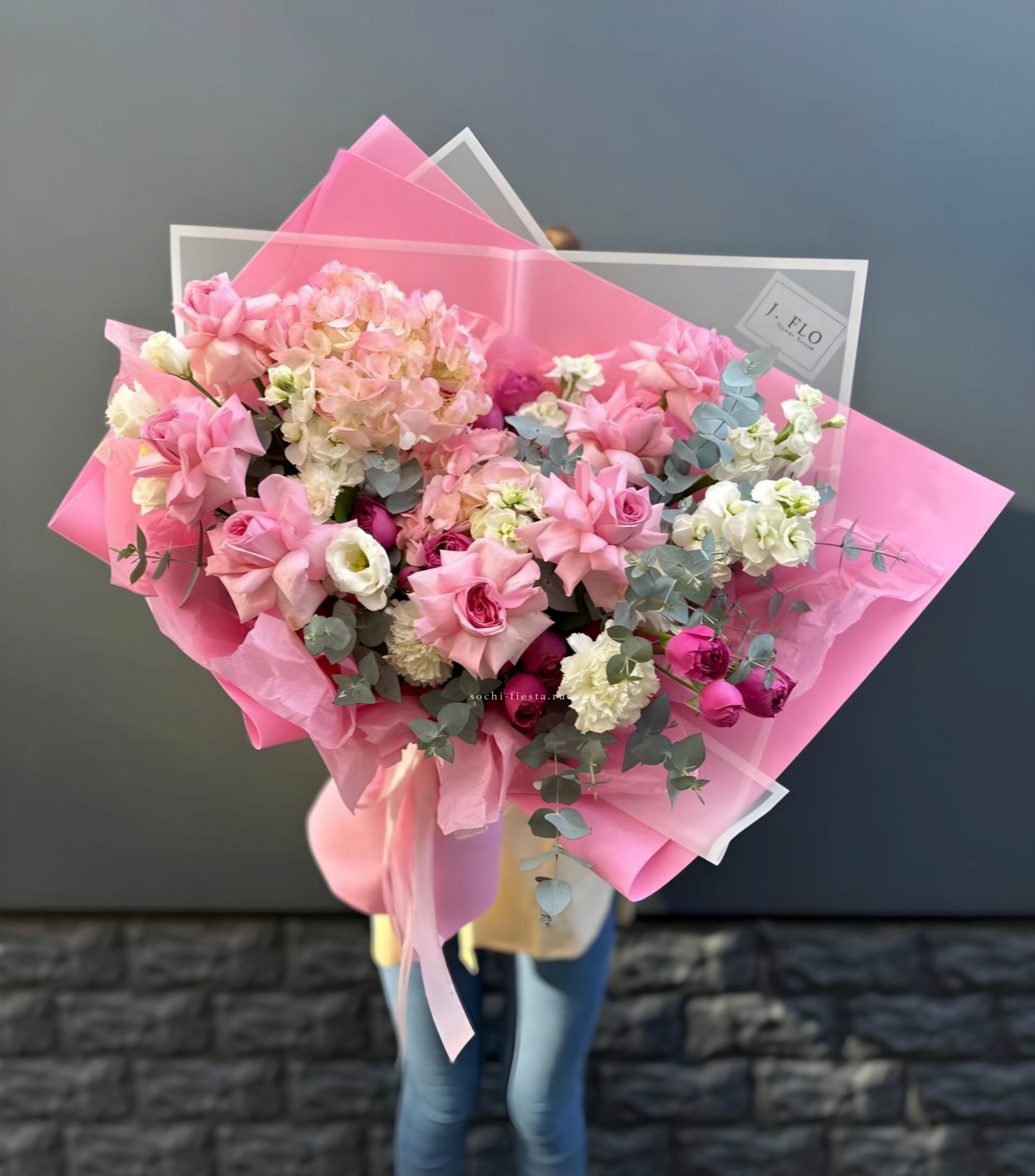 Белые розы и эустома образуют светлую основу, которую дополняют пионы и гортензия. Крафтовая упаковка удерживает форму, позволяя цветам раскрыться естественно и свободно.