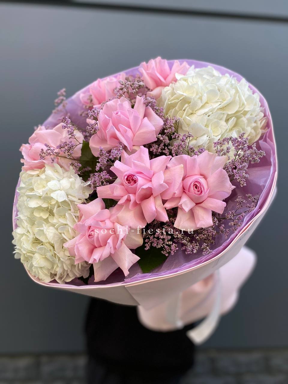 диантус, гербера, кустовая роза, роза белая, лимониум (замена в несезон), дельфиниум/маттиола/львиный зев/гладиолус (замена в несезон), лента, авторская упаковка.