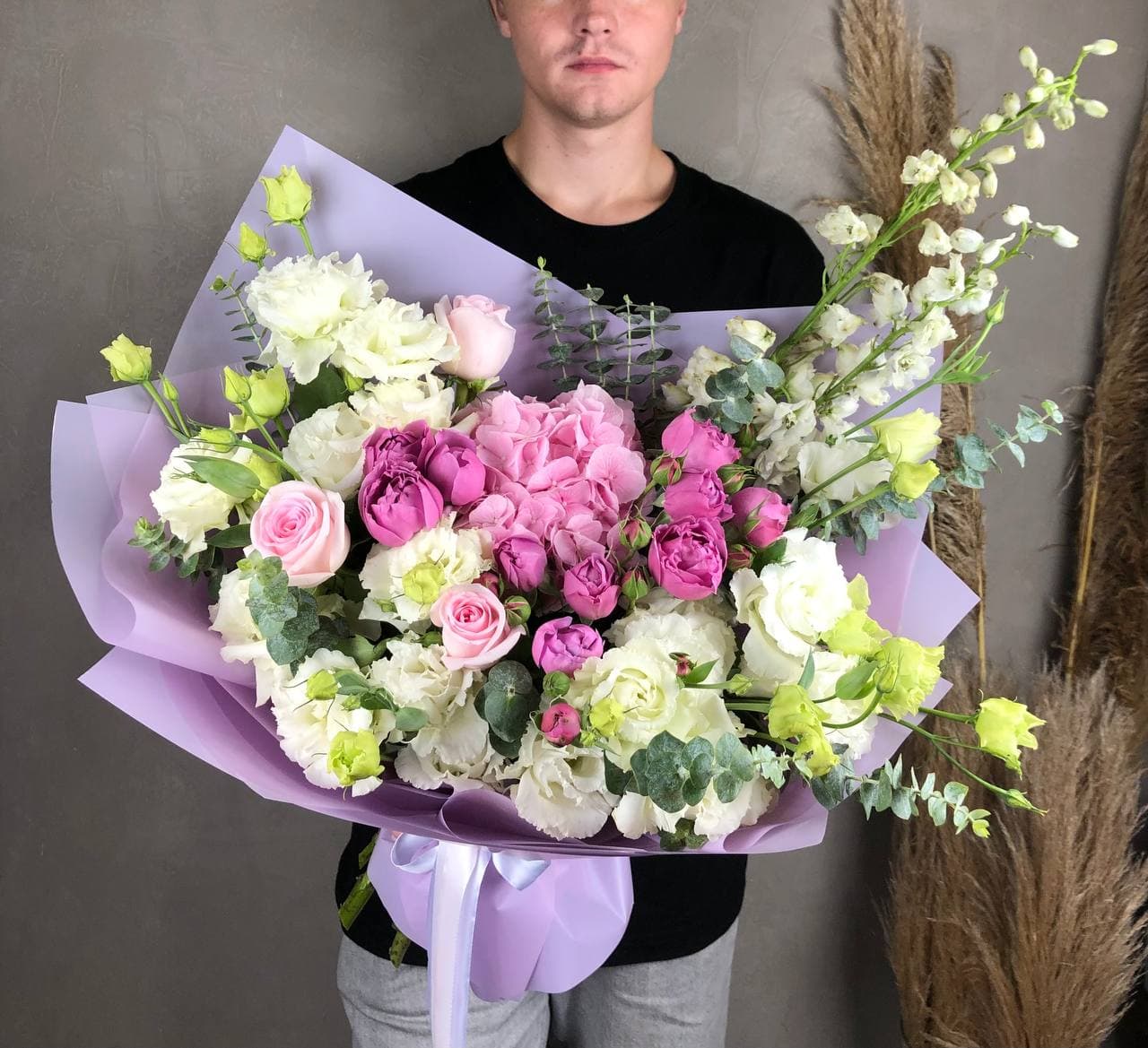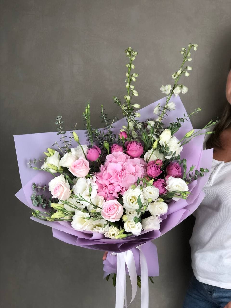 Монохромная палитра с многослойной структурой. Французские розы и эустомы чередуются с кустовыми бутонами, гортензии заполняют объём, а диантусы создают точечные акценты. Букет выглядит цельно и графично.