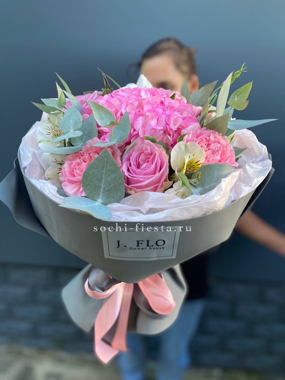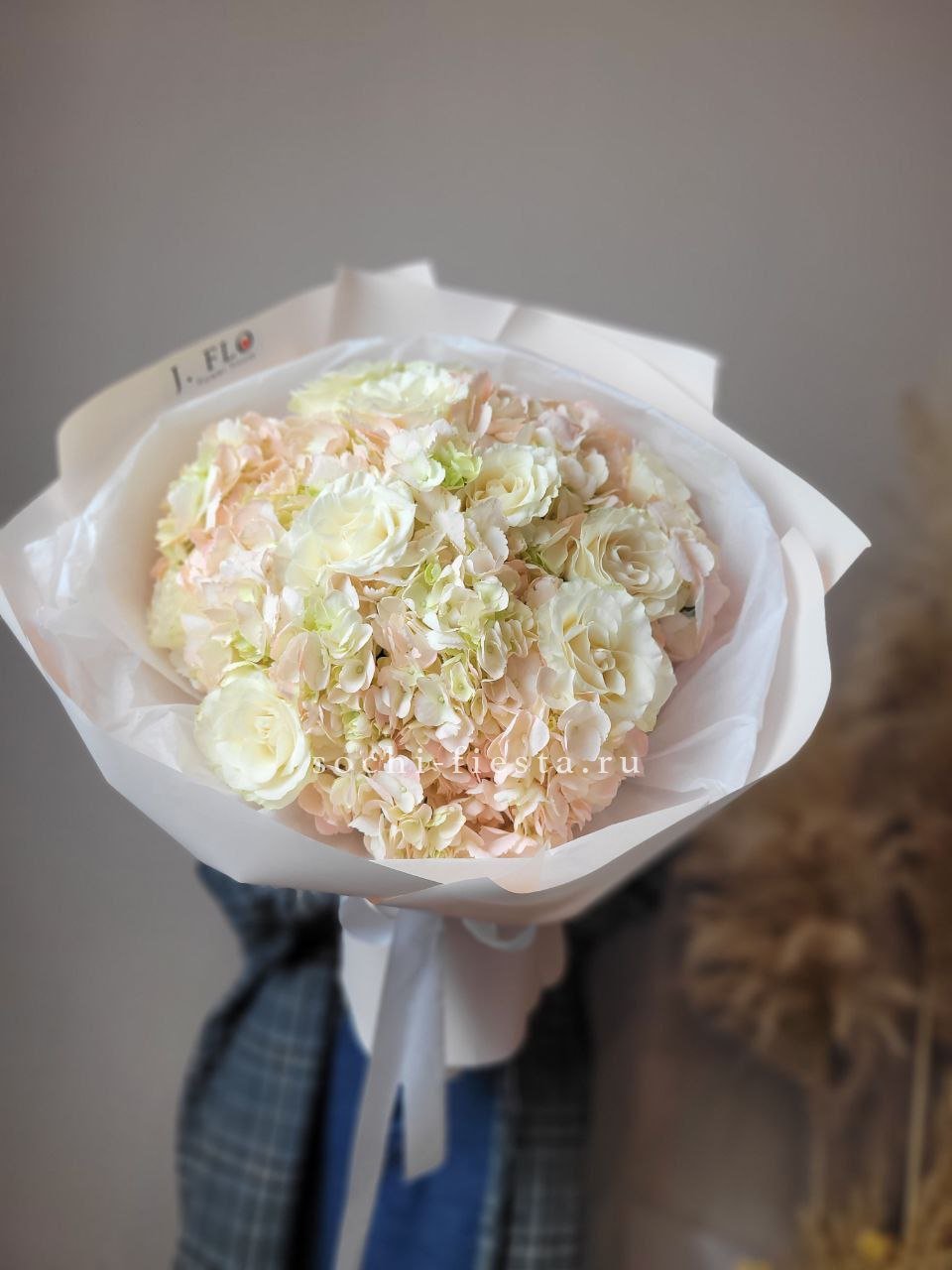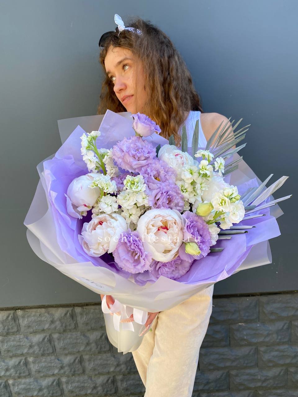 Пионы и эустома собраны в свободную форму где каждый бутон раскрывается в своём ритме. Маттиола и чико дополняют букет мягкими линиями и природной непринужденностью.
