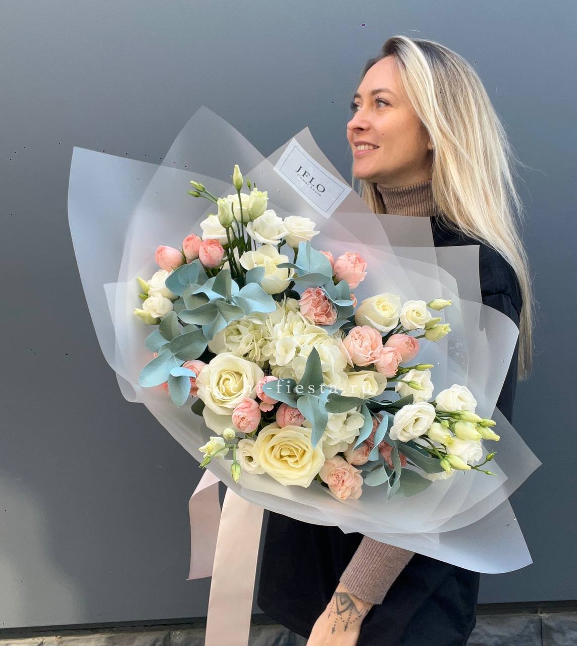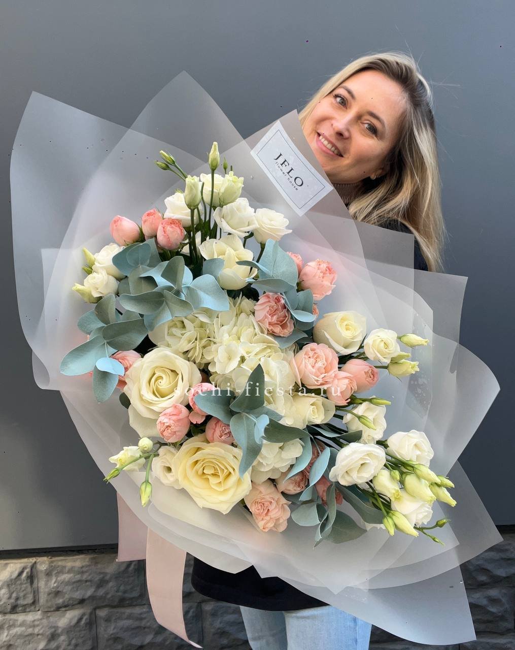 Белые французские розы с пышной гортензией и эустомой образуют воздушную композицию с мягкими переходами оттенков. Эвкалипт добавляет свежести и завершает форму.