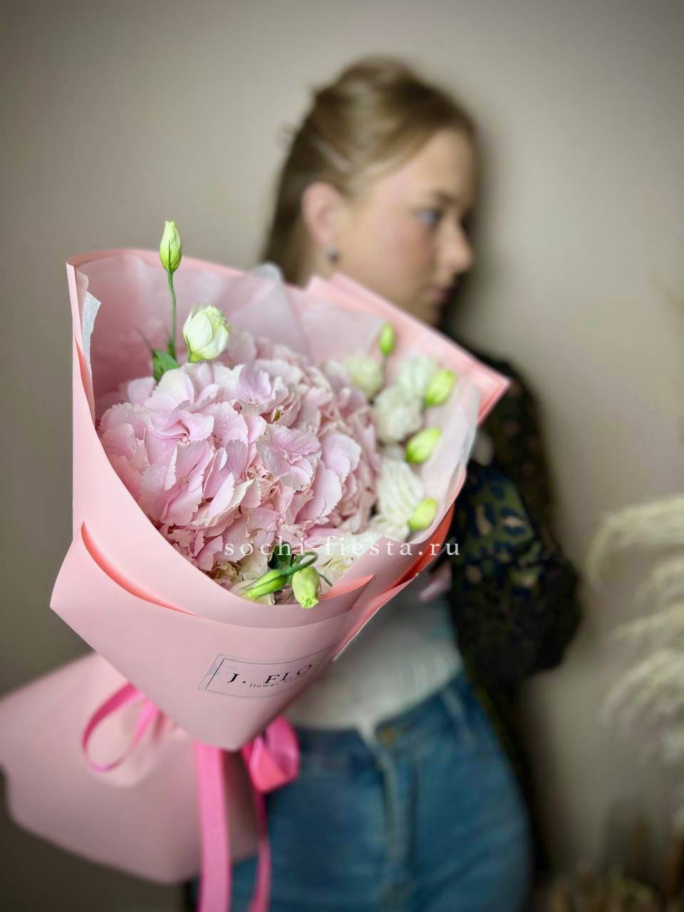 гербера, роза, хлопок, гортензия, диантус, эвкалипт, упаковка.