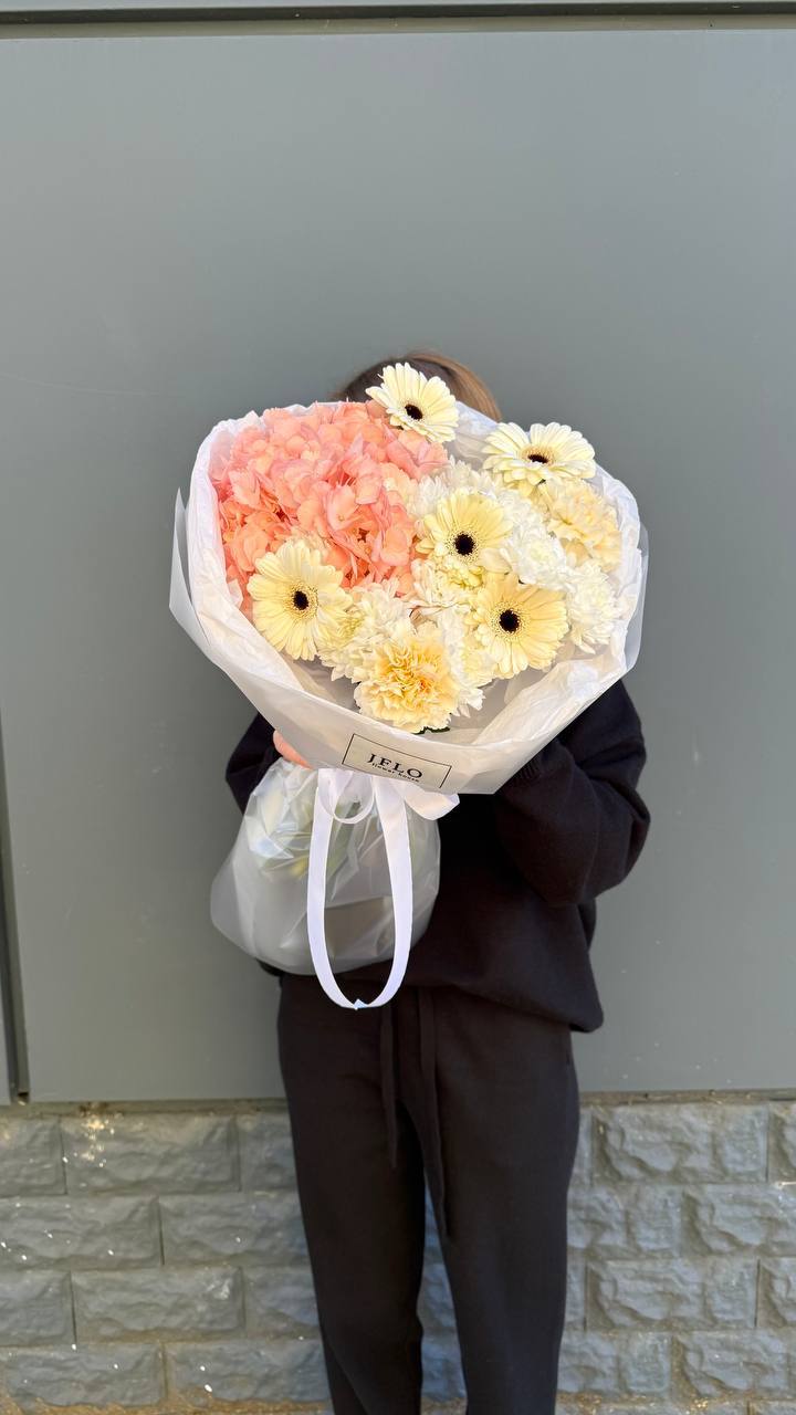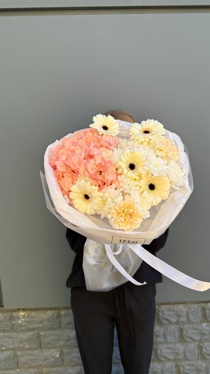 Плотная сборка с пышной гортензией в центре и рассыпчатыми соцветиями диантуса по краям. Эустома добавляет воздушности, а ветки озатамуса создают лёгкую графику. Букет держит форму и выглядит объёмно с любого ракурса.