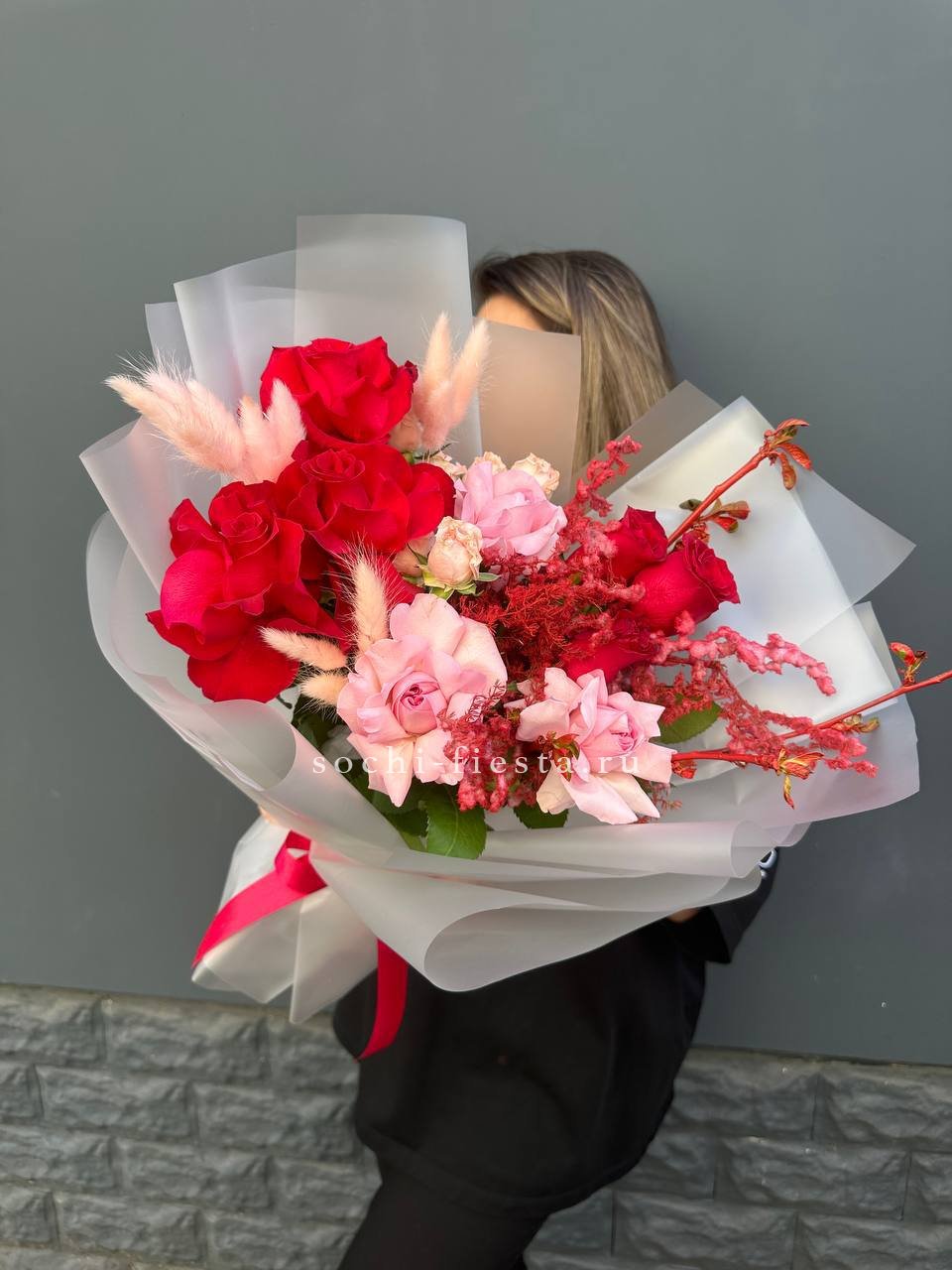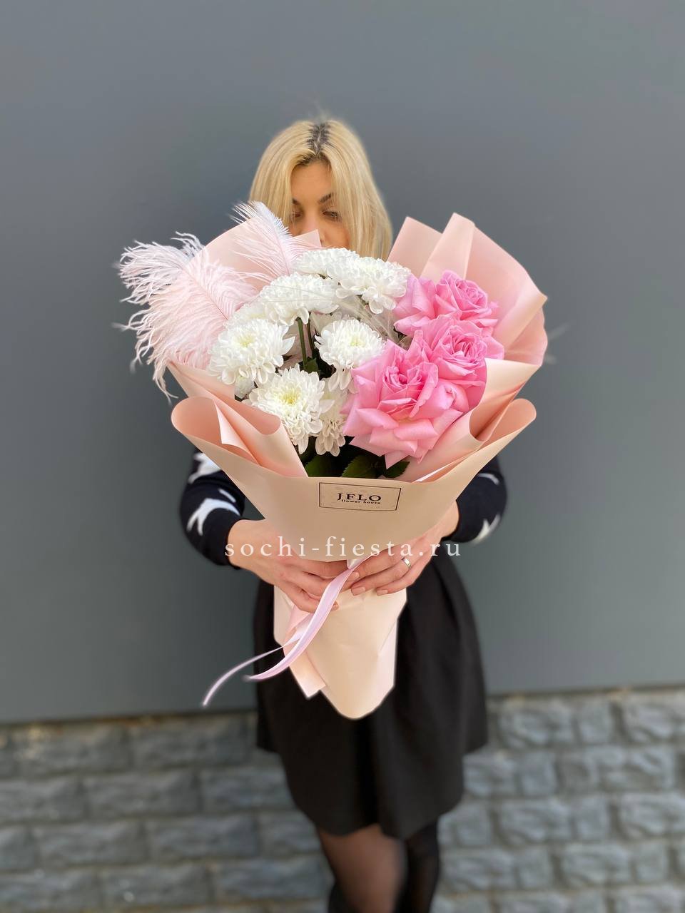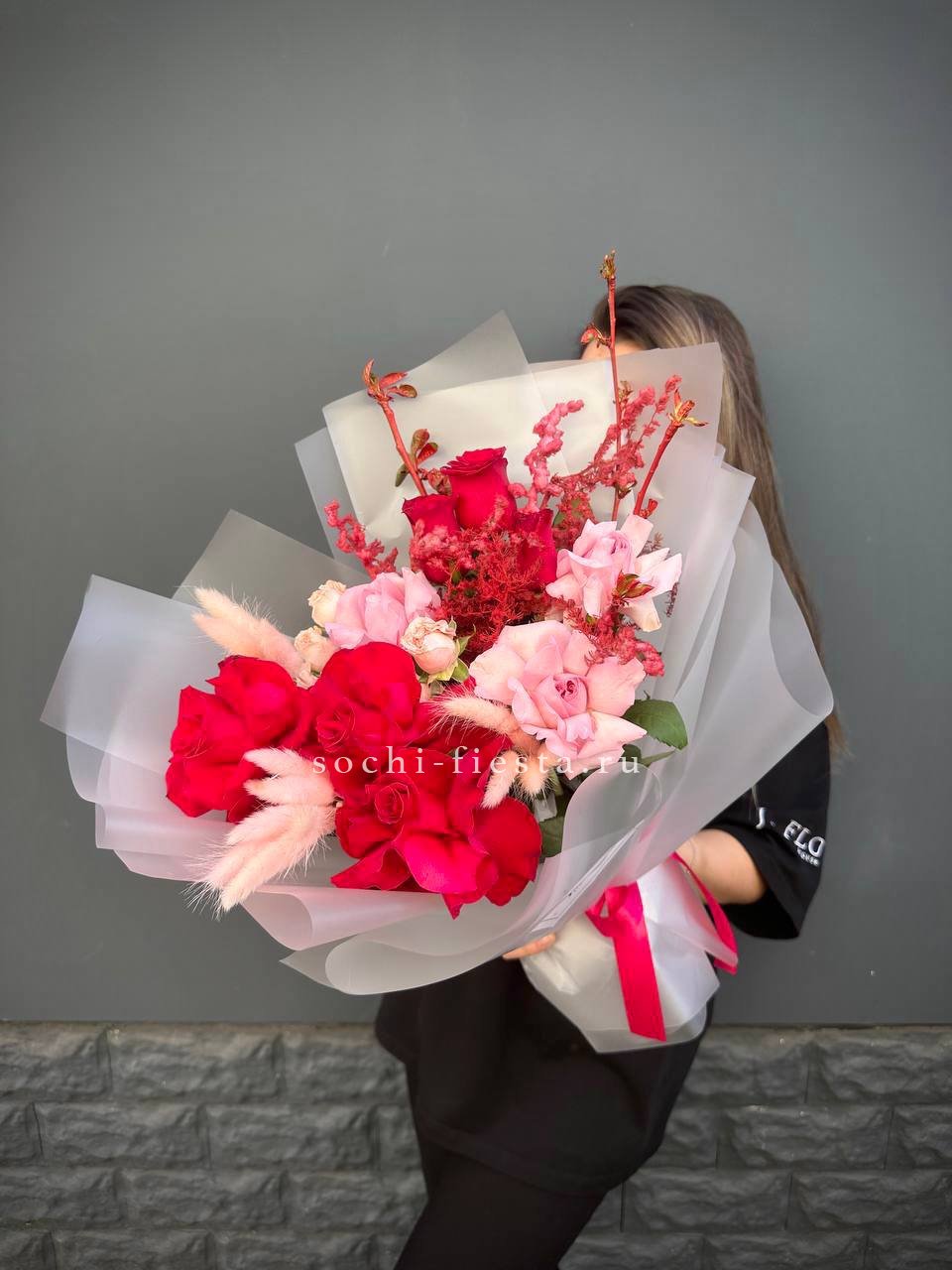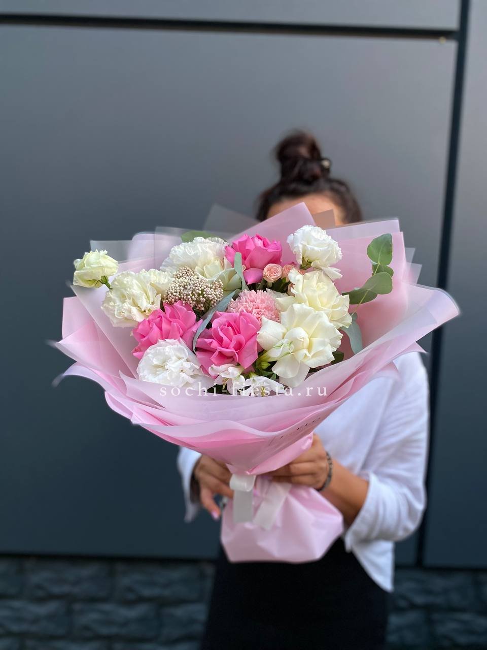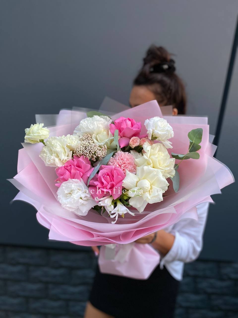 розовые розы, белые розы, диантус, бомбастик, гортензия, эвкалипт, пленка.