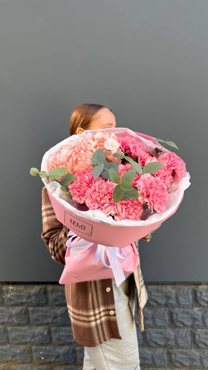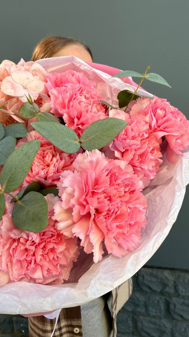 Букет объединяет хризантемы, диантусы, розы, эустому и гортензию в плотную композицию. Корейская пленка удерживает форму и создает графичный силуэт с четкими границами.
