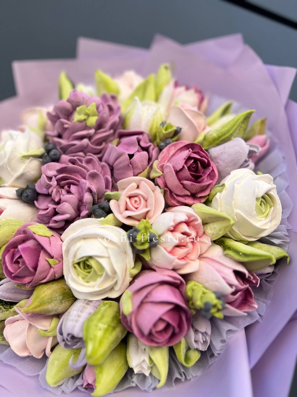 зефир в форме букета цветов. Состав: сахар, патока, пектин, агар, яблочное пюре, яичный белок, натуральный краситель, лимонная кислота. Цена за 1букет, размер М.