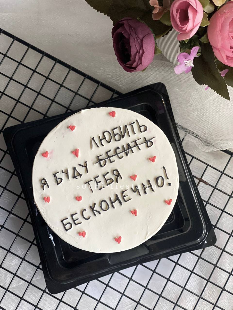 Персональный десерт с графичным рисунком сердец и плотной кремовой поверхностью. Лаконичная форма и выразительный декор делают его запоминающимся. Ручная работа с возможностью выбора начинки.