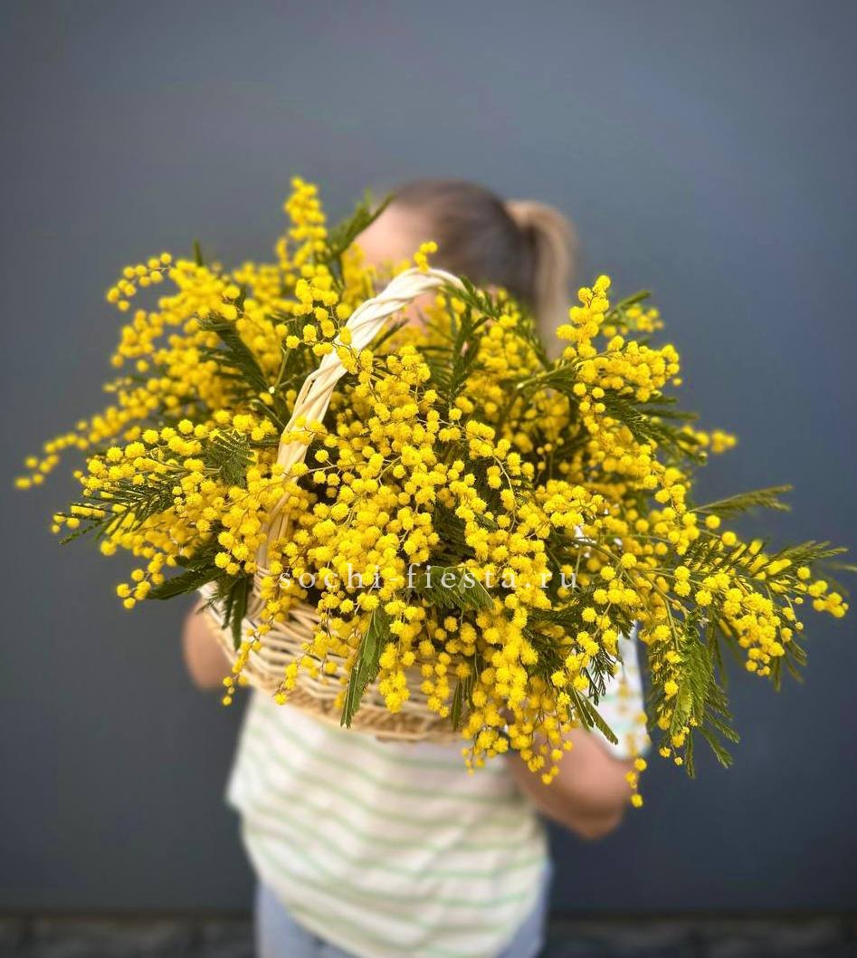 Солнечные шары мимозы собраны в пышную корзину. Яркий жёлтый цвет мгновенно поднимает настроение и напоминает о первых тёплых днях.